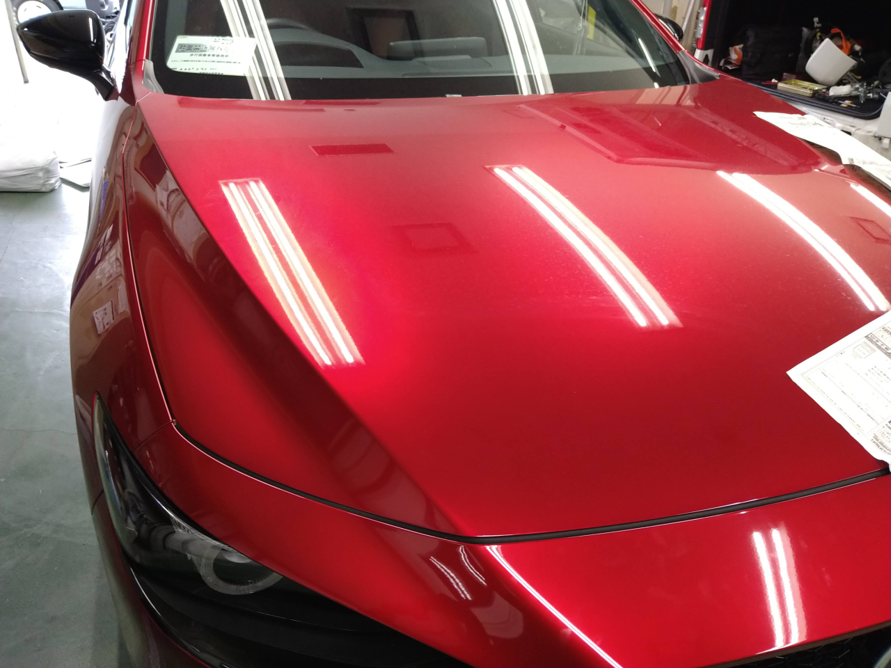 写真の赤色はマツダの車なのですが、ソウルレッドクリスタルメタリック(46V)というカラーなのですが〖修理の事考えて売らんかい‼〗ってなもんです!今回はバンパーの角を少し直すだけでしたのでなんとかわからないくらいには出来ましたが、完璧は無理ですね。